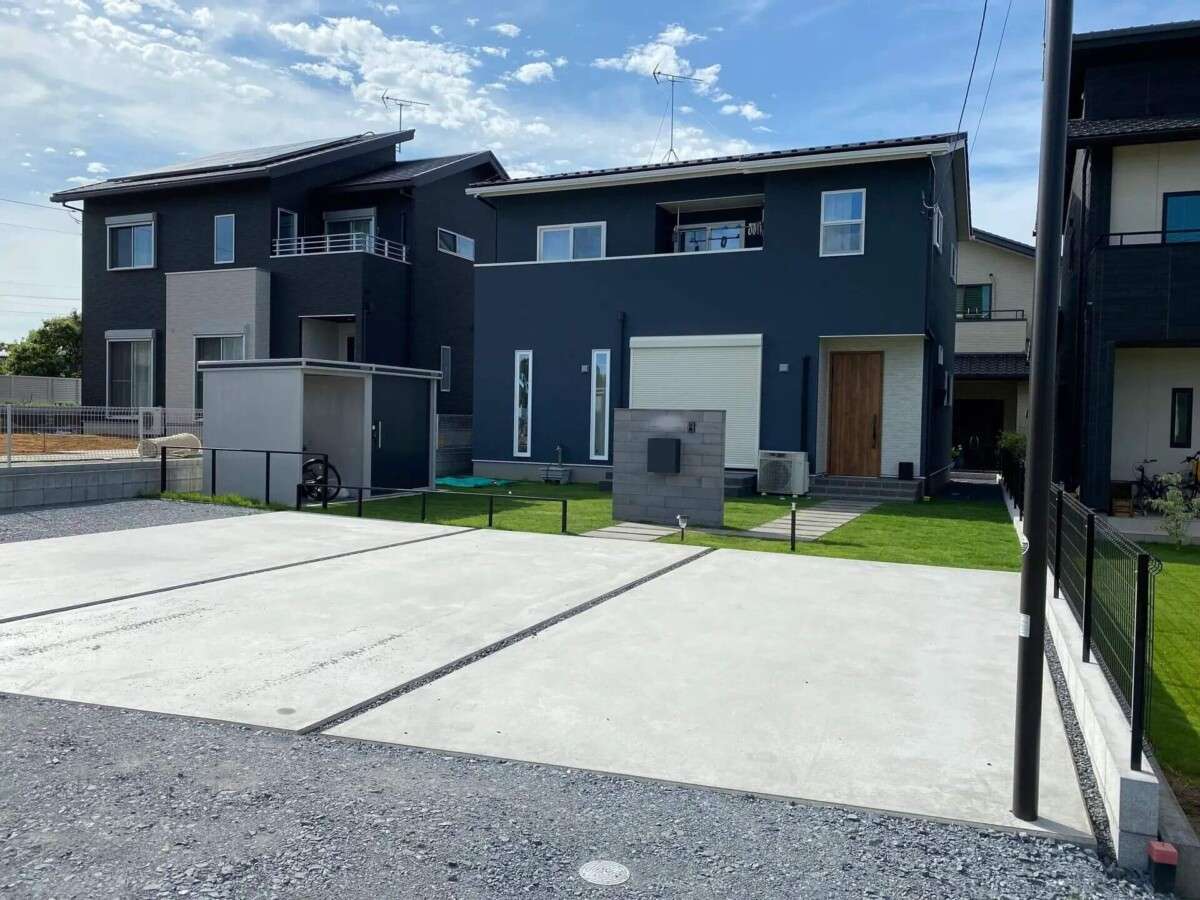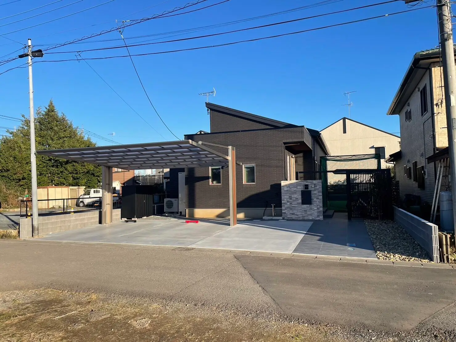 広い駐車場にシンプルですがレンガ調でオシャレな門扉が特徴の造りになっております。駐輪場兼物置も設置し、使い勝手とオシャレさ、両方を兼ね備えたシンプルイズベストな施工となっております。