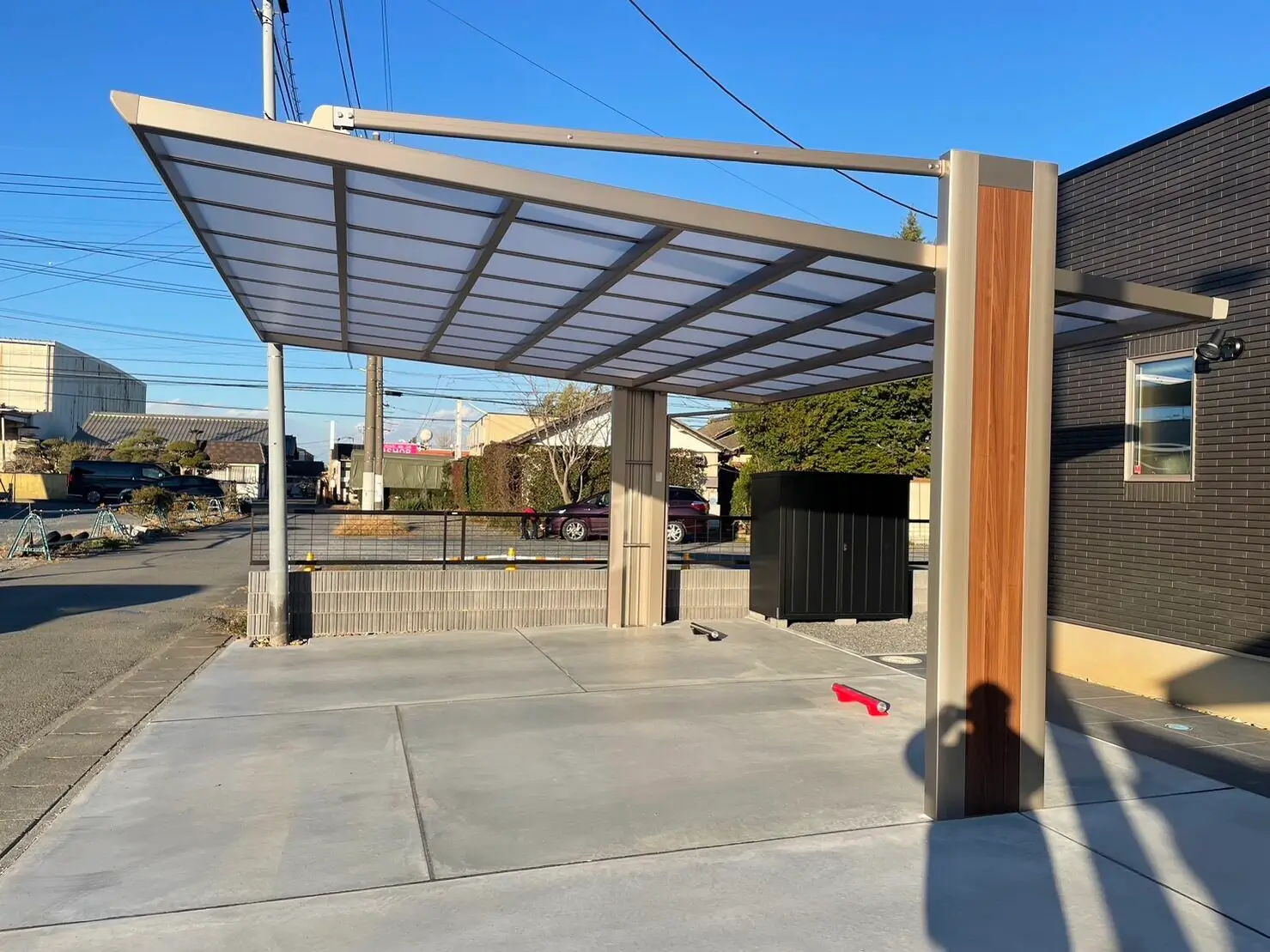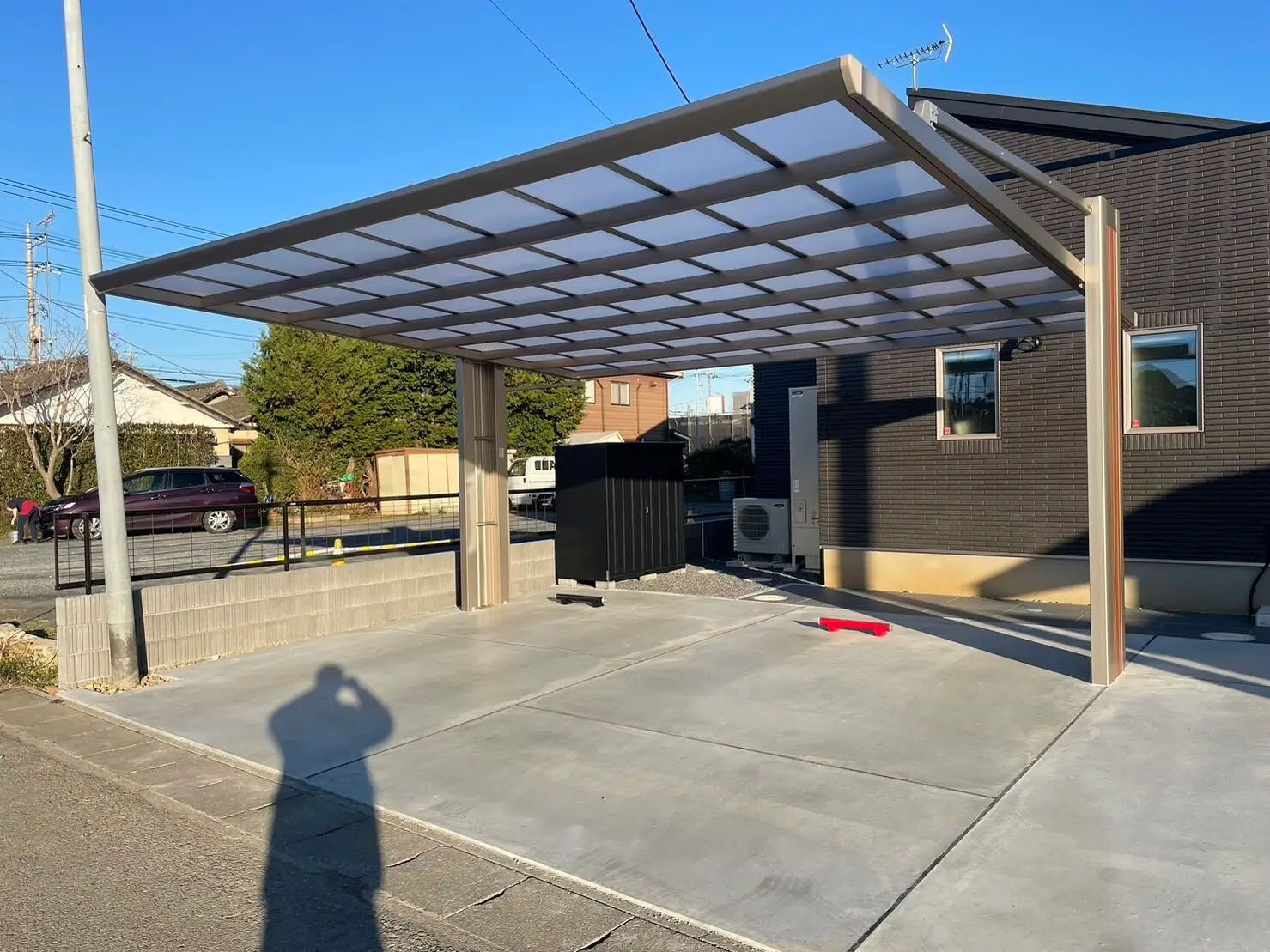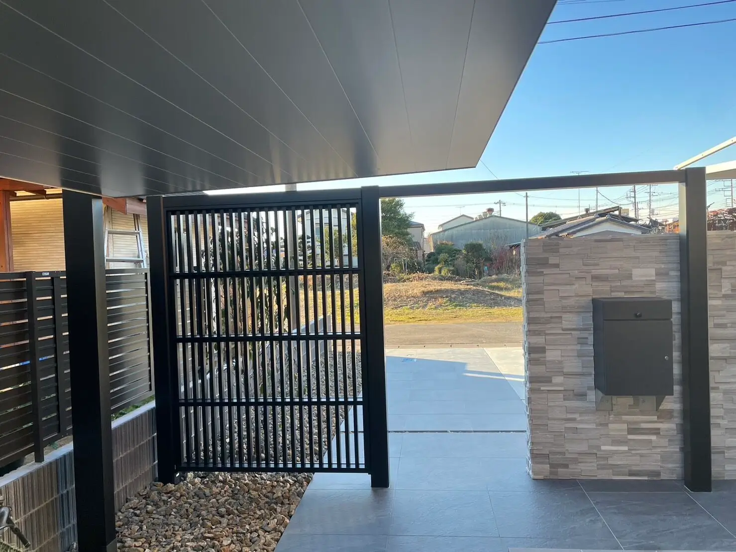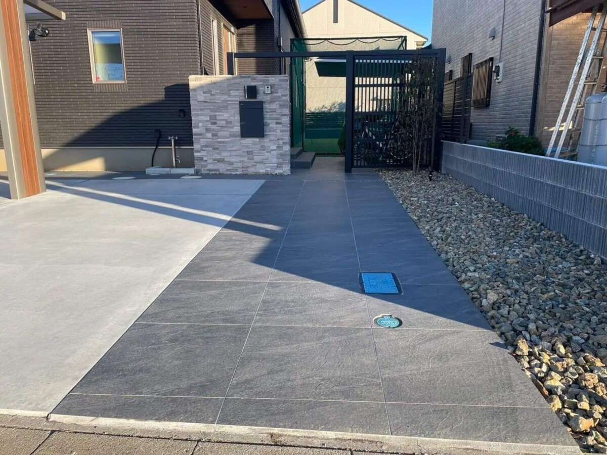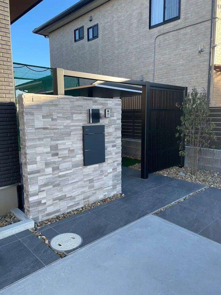 カーポート、サイクルポートなど実用性もある中に植栽、アプローチタイルなどのオシャレさも忘れない。和モダンに仕上がりました。 カーポート サイクルポート 門柱 駐車場コンクリート アプローチタイル 植栽 デザインブロック