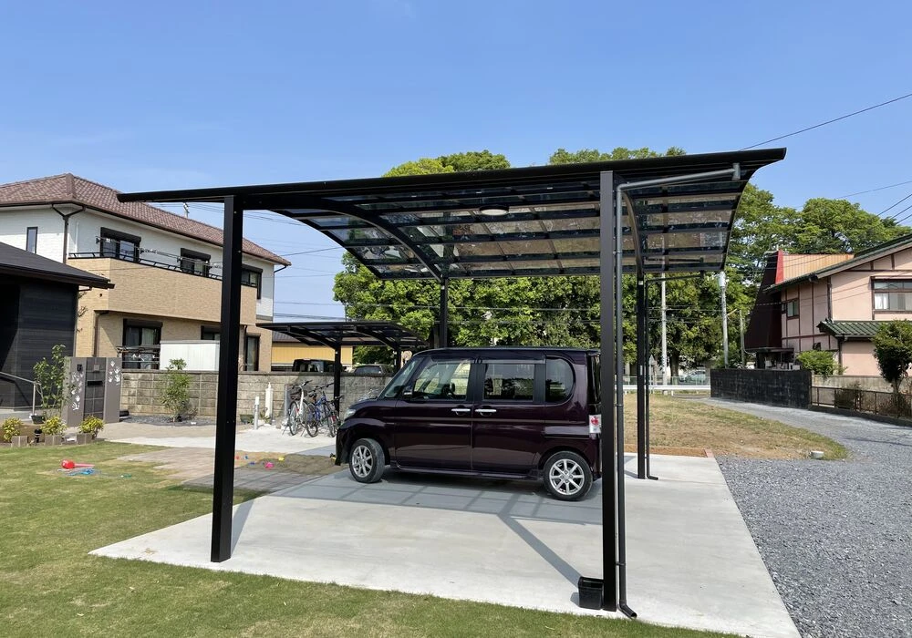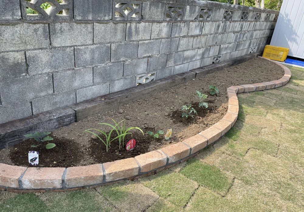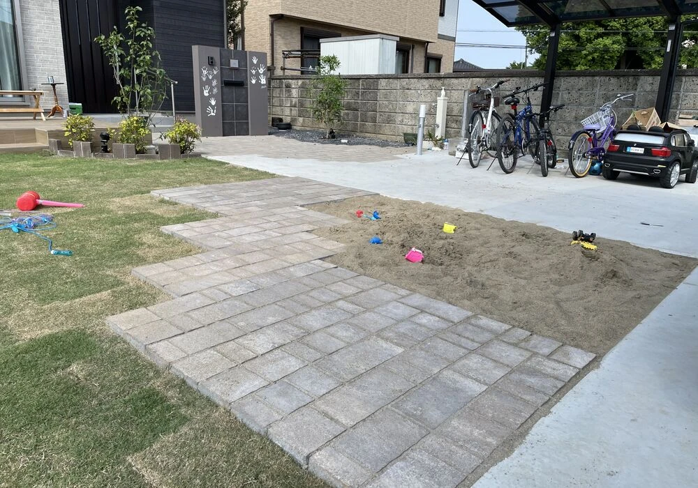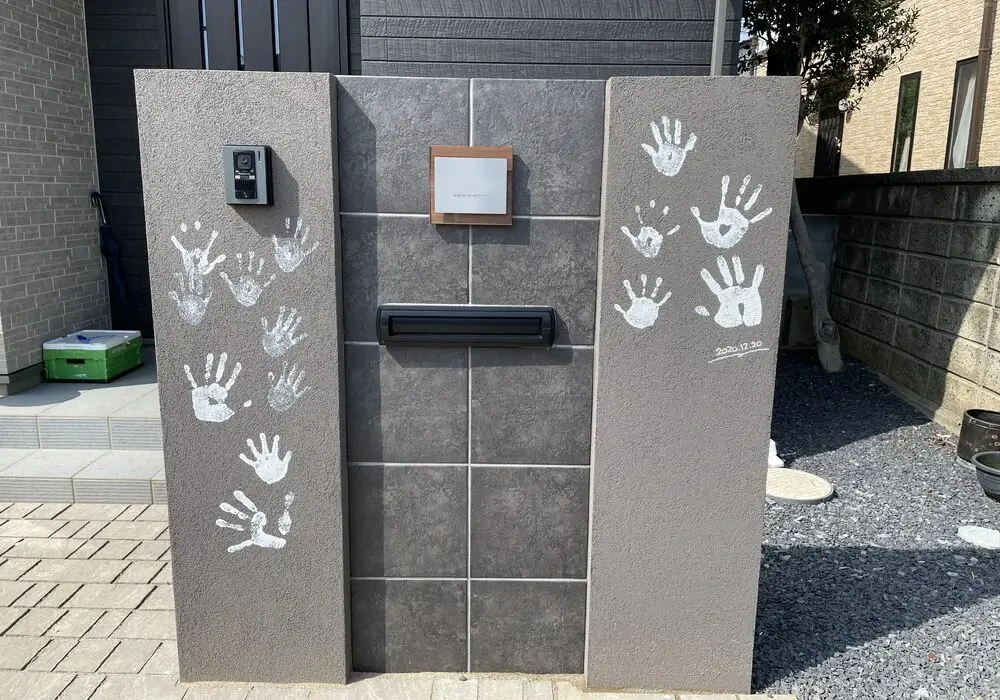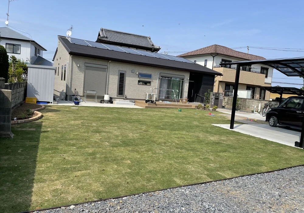 お庭全体に天然芝を敷いてあります。一角には植栽を植え、緑いっぱいの素敵なお庭となっております。また、門柱にはご家族の手形を付けさせていただいています。家族オリジナルの門柱に心が温かくなります。