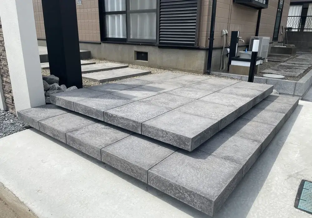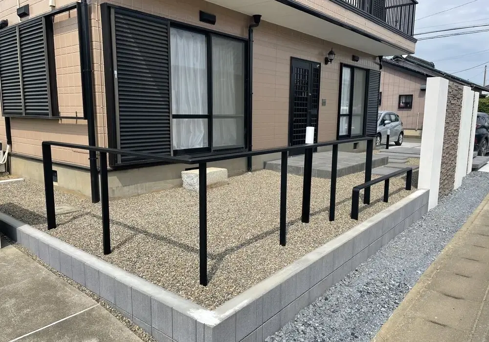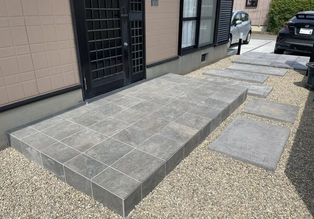 デザイン塀で目隠しを作りました。玄関前におしゃれなデザイン塀を作り、中を見えにくくしました。お家に上がる階段にタイルを使用し、アプローチと色を合わせることで、統一感があり、落ち着いた、おしゃれな仕上がりとなっております。また、タイルは掃除がとてもしやすいので、キレイを保てます。