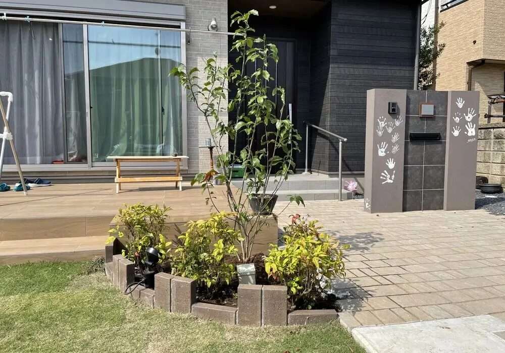お庭全体に天然芝を敷いてあります。一角には植栽を植え、緑いっぱいの素敵なお庭となっております。また、門柱にはご家族の手形を付けさせていただいています。家族オリジナルの門柱に心が温かくなります。